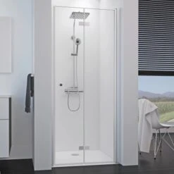 Die Breuer Drehfalttür für Nischen ist aus 8 mm Einscheibensicherheitsglas. Der 4-fach Hebe-Senkmechanismus erleichtert das Öffnen und Schließen der Tür. Die Tür lässt sich komplett an die Wand falten. Der Knopfgriff mit Gummipuffer verhindert ein hartes Anschlagen an der Wand oder dem Glas. Die Türen lassen sich nach innen und außen öffnen.