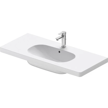 Das weiße Duravit Möbelwaschbecken D-Code 105 cm mit einem Hahnloch Wurde von sieger designt und aus Sanitärkeramik gefertigt. Es kommt mit Überlauf und Hahnloch für eine Einlocharmatur. Das große, rechteckige Becken mit gerundeten Ecken ist passend zum D-Code Waschtischunterbau.