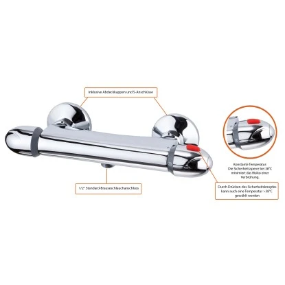 Eisl Vital Thermostat Duscharmatur Chrom. Der genormte 1/2 “ Brauseabgang ermöglicht den Anschluss vieler handelsüblicher Duschschläuche. Die Thermostatarmatur ist werkseitig mit einer Temperatursperre bei 38° ausgestattet und minimiert damit das Risiko vor Verbrühungen – mehr Sicherheit für die ganze Familie. Für eine höhere Wassertemperatur kann die Sperre deaktiviert werden.