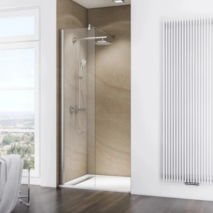 Die 6mm starke Walk In Duschwand der Serie MasterClass von Schulte bereichert jeden Raum mit ihrer brillanten Transparenz. Diese wird durch das hochwertige sowie stabile Sicherheitsglas der freistehenden Scheibe erzeugt. Darüber hinaus ermöglicht die teilgerahmte Optik der Duschkabine mit innenbündigen Scharnieren sowohl eine einfache Montage der Duschabtrennung als auch eine langfristig unkomplizierte Reinigung. Die Duschwand Walk In M6 kann wahlweise auf einerDuschwanne positioniert werden oder aber barrierefrei direkt auf dem Boden.