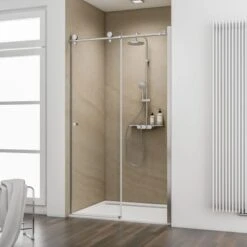 Die Schiebetür mit Feststellelement rechts der Serie MasterClass von Schulte verfolgt einen eleganten Look, der von einer dezenten Rahmung sowie einer formschönen Laufschiene bestimmt wird. Der grazile, runde Griff folgt dieser Linie ebenfalls.