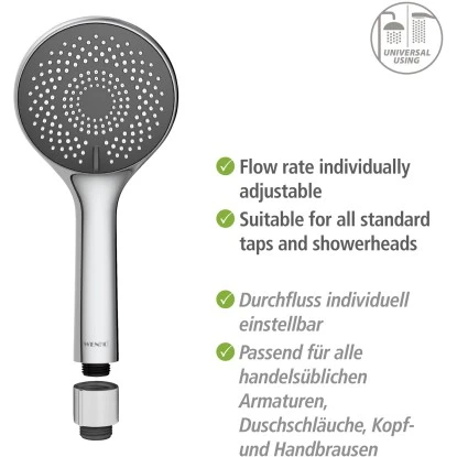 Dauerhaft sind sogar bis zu 60 % Ersparnis möglich – und das ganz ohne Komfortverlust. Für eine entspannende Dusche sorgen der Überkopfbrause (Ø 20 cm) mit einem angenehmen Regenschauer und die Handbrause (Ø 11 cm) mit fünf verschiedenen Funktionen – darunter ein kräftiger Massagestrahl. Die Brauseköpfe bestehen aus Kunststoff (ABS) und sind mit Noppen für eine einfache Kalkreinigung ausgestattet.