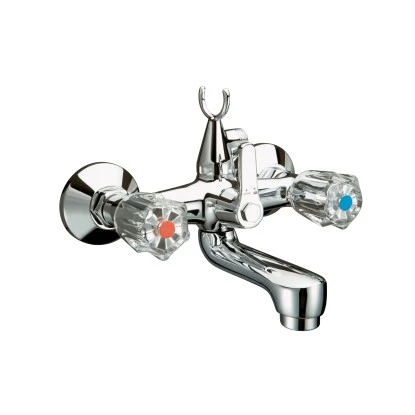 Die verchromte Zweigriff-Wannenarmatur aus der Serie Ledro ist für die Wandmontage an einer Badewanne konzipiert und besitzt eine klassische Form. Es handelt sich um eine traditionelle Wannenarmatur mit zwei Griffen zur Einstellung der Durchlaufmenge und Mischung der Temperatur. Sie verfügt über einen Umsteller für Wannen- oder Brausefunktion. Ausgestattet ist sie mit einer geprüften Kartusche, einer Mischdüse und einem Gabelhaken für die Handbrause. Außerdem verfügt die Armatur über Fettkammeroberteile am Anschluss der beiden Griffe. Der Anschluss erfolgt mit zwei im Lieferumfang enthaltenen S-Anschlüssen. Zwei Rosetten bedecken die Zuläufe an der Wand.